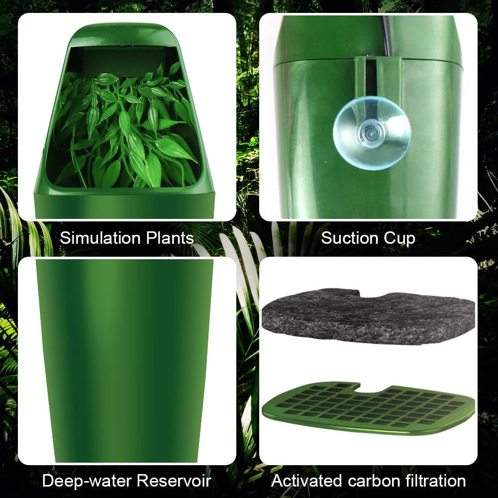 Si tienes reptiles (camaleones, lagartos, tortugas, serpientes…), esta fuente de agua les vendrá genial. Simula una cascada natural con hojas por donde cae el agua, lo que estimula que beban más. Tiene un depósito de 800 ml (suficiente para 5-7 días) y un sistema de doble filtro con algodón de carbón activo para mantener el agua limpia. La bomba es mejorada, muy silenciosa y no se quema si se queda sin agua. Se puede instalar en terrarios de vidrio o jaulas de rejilla. ¡Tus mascotas estarán más hidratadas y felices!